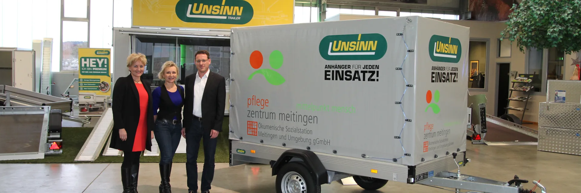 Holzheim - The company UNSINN from Holzheim donates 1200 Euro to DKMS and a trailer with tarpaulin to the Social Center Meitingen. True to the motto "Donating instead of just giving", UNSINN waives presents for business customers and supports social projects instead. This is why the Social Center Meitingen can be given a new trailer. "It really simplifies work for my employees as we can for example easily transport the donations for the Tafel from A to B", managing director Jürgen-M. Werner happily tells about his new trailer.