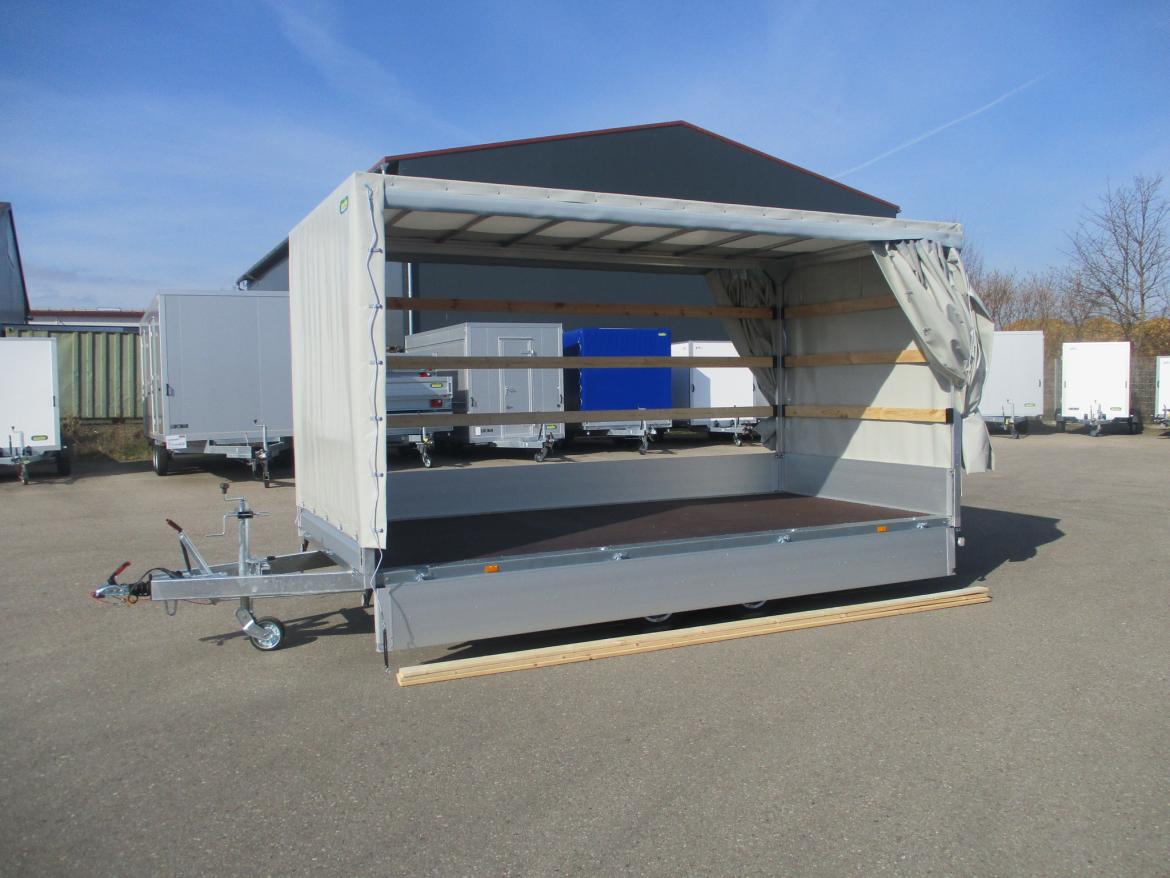 2,6 to Pritschenhochlader mit Niedrigbereifung auf 10“-Alufelgen mit Planenaufbau LH 2000 mm und Schiebeplane links und rechts, hellgrau Total weight 2.600 kg Internal dimensions 4.260 × 2.040 × 2.000 mm Show trailer