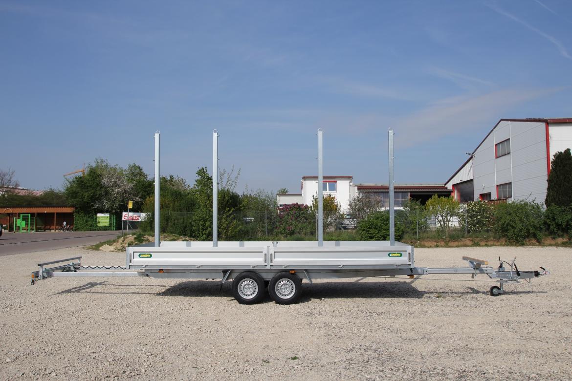 3,5 t Langmaterialanhänger mit 4 Einsteckungen und ausziehbarem Heckleuchtenträger Total weight 3.500 kg Internal dimensions 5.460 × 2.040 × 350 mm Show trailer