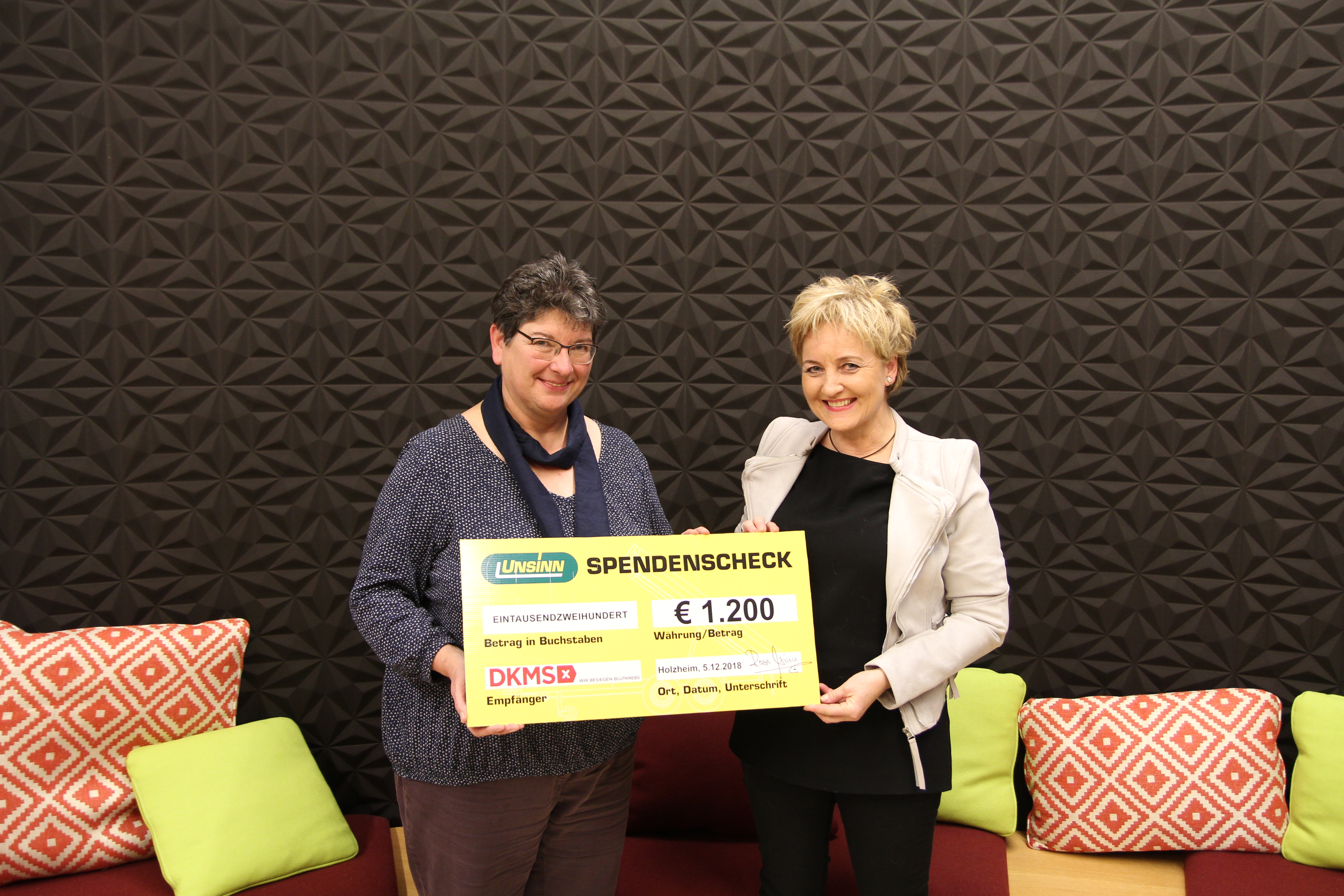 DKMS can be happy about a monetary donation of 1200 Euro. They can use the money for typing (35 Euro per test). With a simple saliva test one can be taken in the donor database and thus can safe lives. "Many people in many places going many little steps can change the face of the whole world." This is how Brigitte Lehenberger describes her volunteer work for the DKMS. With regular typing events for example at schools and companies potential donors should be informed and inspired to take part. The company UNSINN is planning such an event for the year 2019. "At the last event 2008 in our premises many new donors could be taken in the database", says manager Rosa Unsinn.