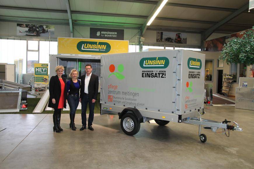 Holzheim - The company UNSINN from Holzheim donates 1200 Euro to DKMS and a trailer with tarpaulin to the Social Center Meitingen. True to the motto "Donating instead of just giving", UNSINN waives presents for business customers and supports social projects instead. This is why the Social Center Meitingen can be given a new trailer. "It really simplifies work for my employees as we can for example easily transport the donations for the Tafel from A to B", managing director Jürgen-M. Werner happily tells about his new trailer.