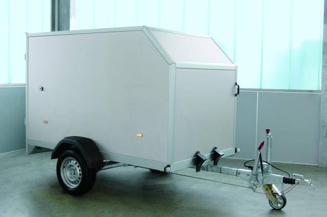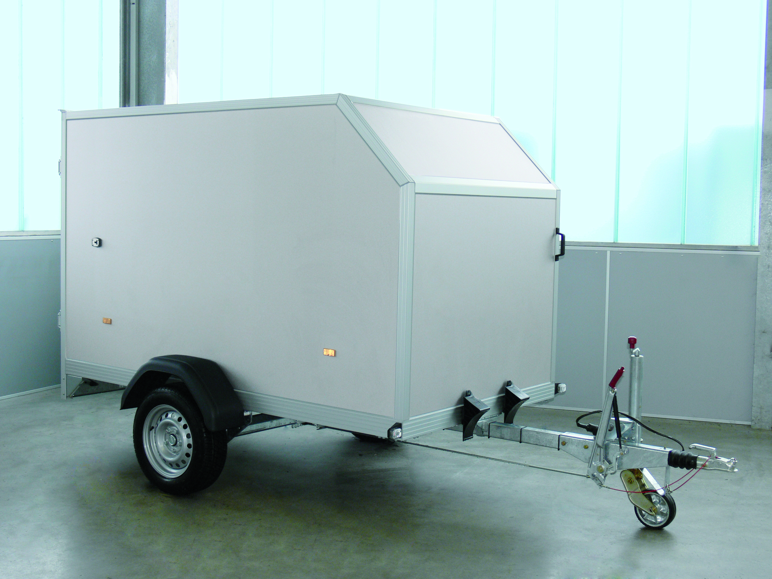 The drop-type cargo trailer Type KK and LKK are ideal when a low loading height is necessary. The difference is that the cargo trailer KK has a welded frame and the LKK has a screwed frame. The PK trailers are high loaders with particularly smooth driving characteristics. The exposed superstructure allows various possibilities for special equipments. No wonder the PK can be used as a promotion trailer, a sales stand, a mobile stage or a snack car. Overall weight: 2,000 kg to 3,500 kg; load capacity: 1,220 kg to 2,625 kg.