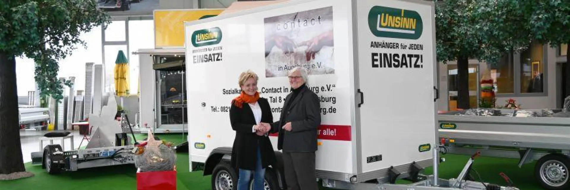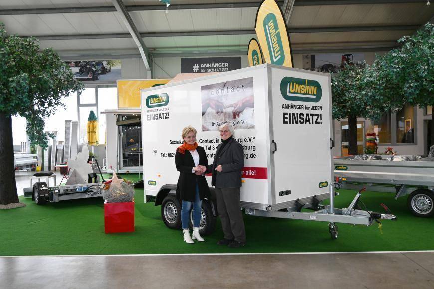 Die Firma UNSINN aus Holzheim spendet einen Kofferanhänger an contact in Augsburg e.V. Getreu dem Motto „Spenden statt Schenken“, verzichtet das Unternehmen auf Geschenke für Geschäftskunden und unterstützt soziale Projekte. So kann sich dieses Jahr der Verein contact in Augsburg, der das Sozialkaufhaus betreibt über einen neuen Anhänger freuen. „Das erleichtert meinen Mitarbeitern wirklich die Arbeit, wenn wir z. B. von anderen wohltätigen Vereinen eine Veranstaltung mit Biertischgarnituren unterstützen können“, schwärmt die Vorständin Roswitha Kugelmann über ihren neuen Anhänger.