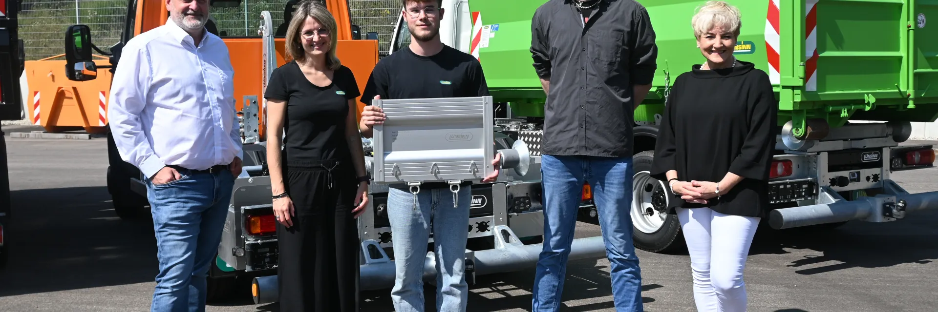 Im Bild (v.l.n.r.): Geschäftsführer Gunnar Bregler, Ausbildungsleiterin Juliane Noppinger, Techn. Produktdesigner Fabian Matt, Ausbilder Johannes Schmid & Geschäftsführerin Rosa Unsinn