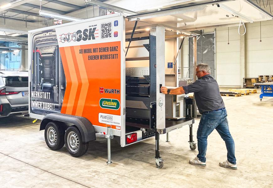 Bühne frei für die flexible, individuell konfigurierbare Werkstatt im PKW-Anhänger – eine Kooperation der GSK Gebrüder Klos GmbH, PlugVan und UNSINN Fahrzeugtechnik. Der innovative Anhänger feierte Premiere auf der NUFAM 2023.