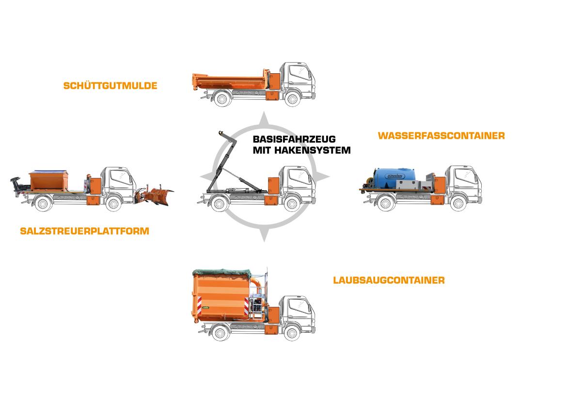 The simple and quick change of containers and superstructures means that an UNSINN municipal vehicle is optimally utilised at all times of the year. This not only saves time and money, but also creates space for more important things at the building yard. We offer standard containers in many sizes and designs. Of course, customised solutions can also be implemented.