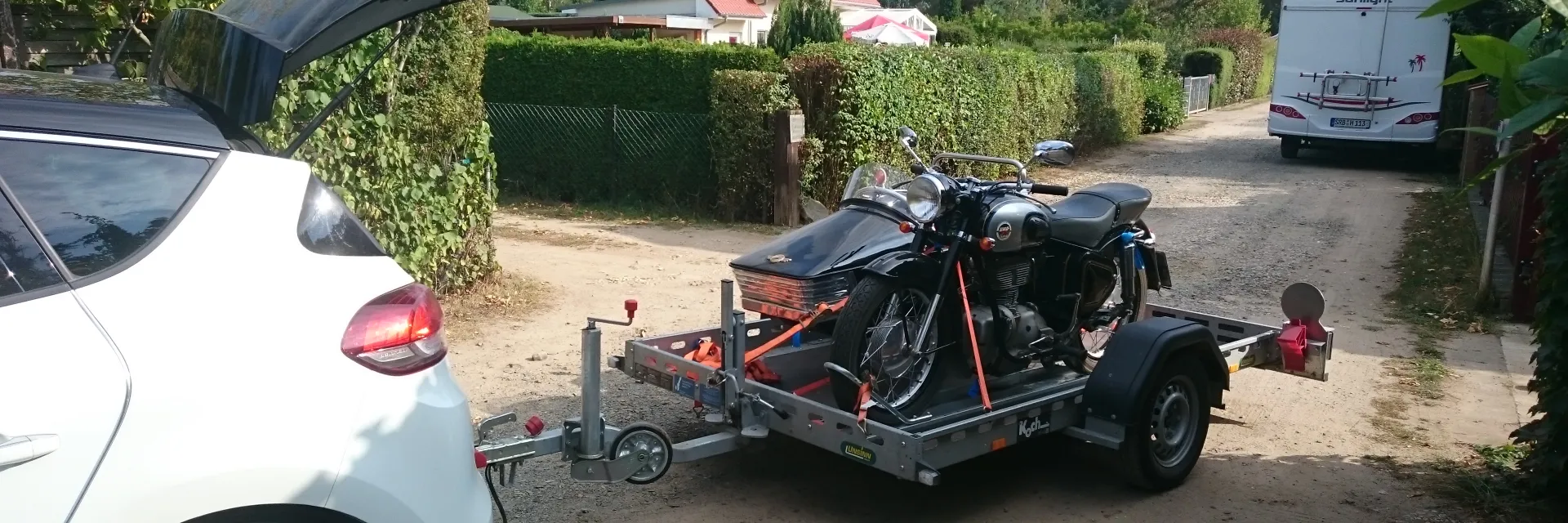 Since the beginning of the year I am usng the 750 drop-type motorcycle trailer from Unsinn for the Transport of my SIMSON AWO 425 S with sidecar (270 kg / oldtimer). The trailer is practice-oriented, well thought out regarding the construction and I can load and unload it all by myself. Also the driving characteristics are very smooth and the trailer is easily manoeuvrable.