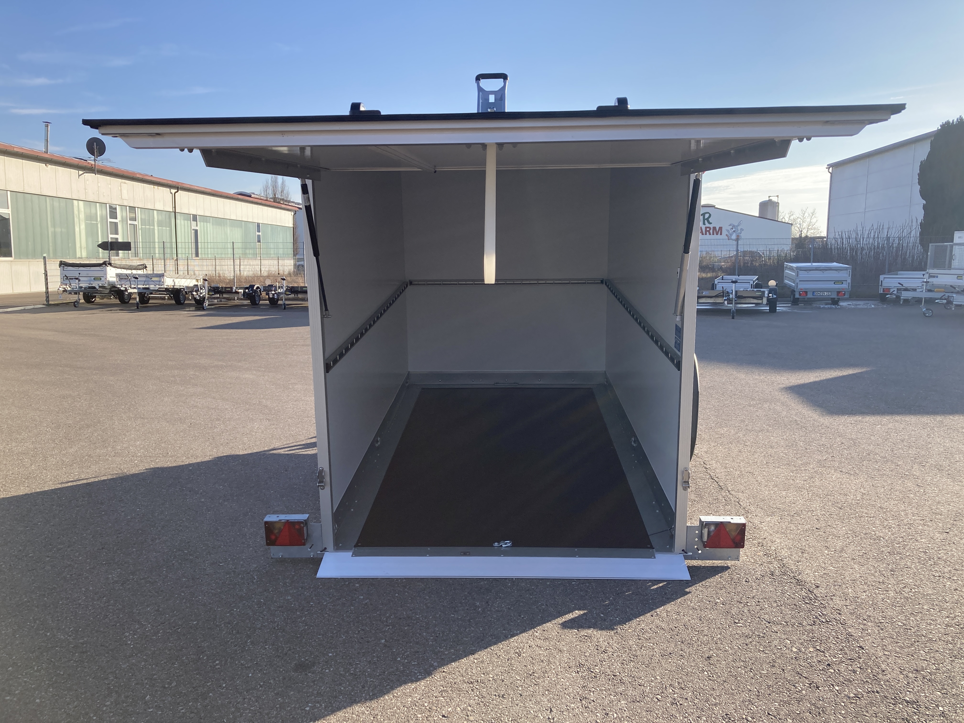 Anhänger gesenkt, Vorteile erhöht! Mit den Absenkkofferanhängern Typ ASK verbinden wir die Vorteile eines gewöhnlichen Kofferanhängers mit der in vielerlei Hinsicht nützlichen Funktion des Absenkens. Durch das Absenken können z.B. Fahrzeuge wie Motorräder oder Paletten mit dem Hubwagen mühelos eingefahren werden.