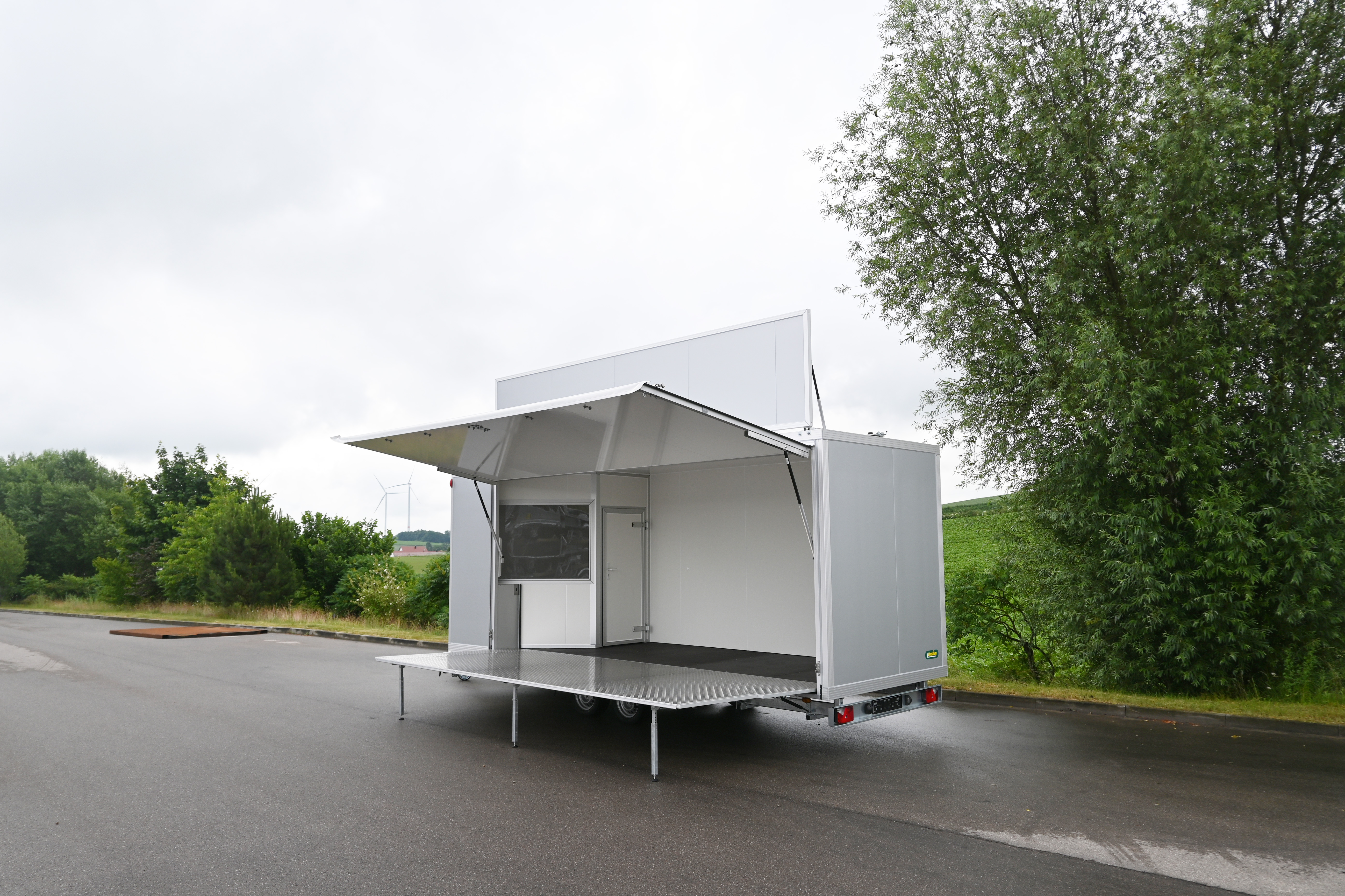 Seitenklappe in Fahrtrichtung rechts mit 2 Gasfedern, Windstützen und außenliegendem Drehstangenverschluss, Öffnungsmaß B x H = 4100 x 1800 mm