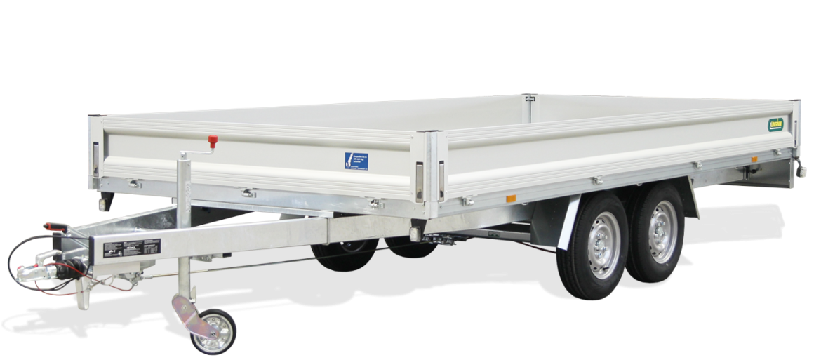 Platform trailers are diversely applicable in daily life. The low loading height is optimally adapted to the tyres, the support wheel is mounted to the robust support wheel crossbeam. The side walls can be completely removed to load and transport bigger goods.